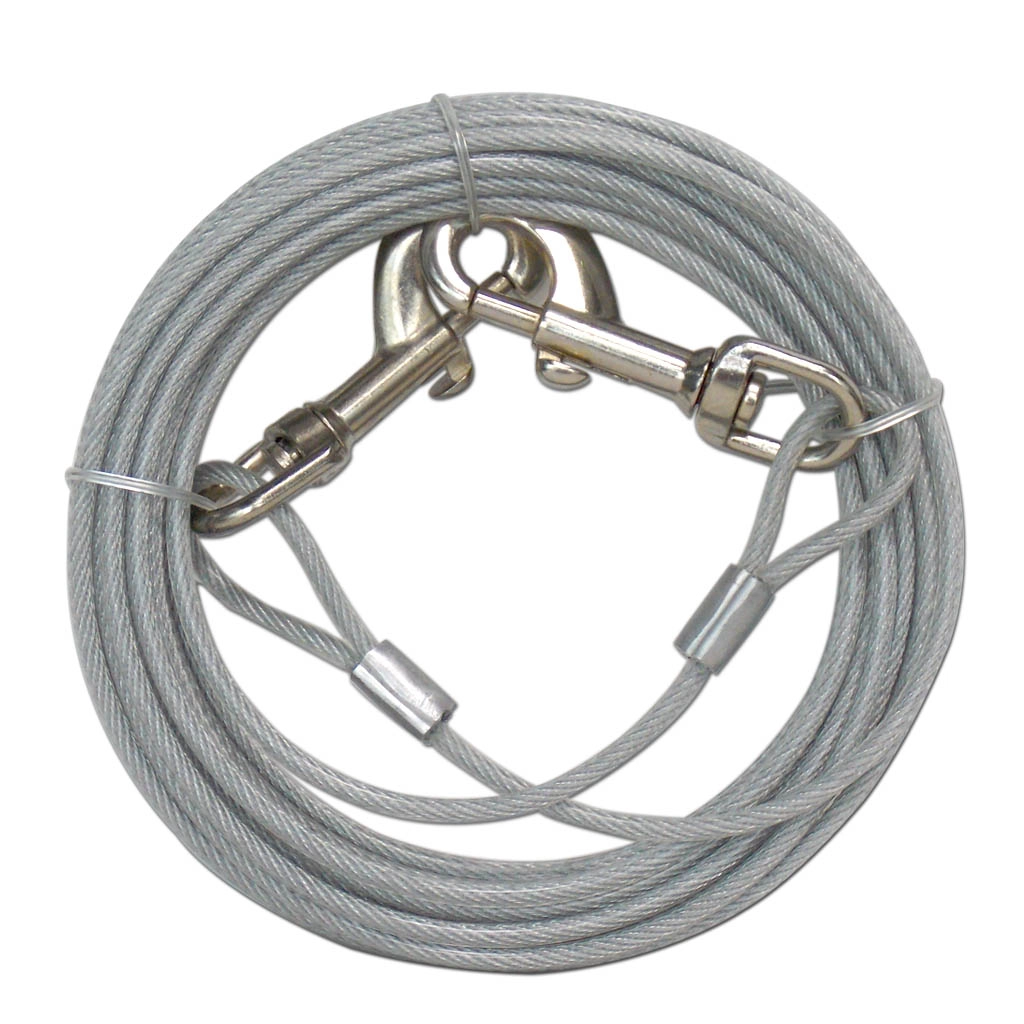 Bahçede yaşayan köpekler için güvenli bir gezinti alanı sağlayan, 9 metre uzunluğunda çelik bahçe bağlama halatı 3 mm kalınlığındır.