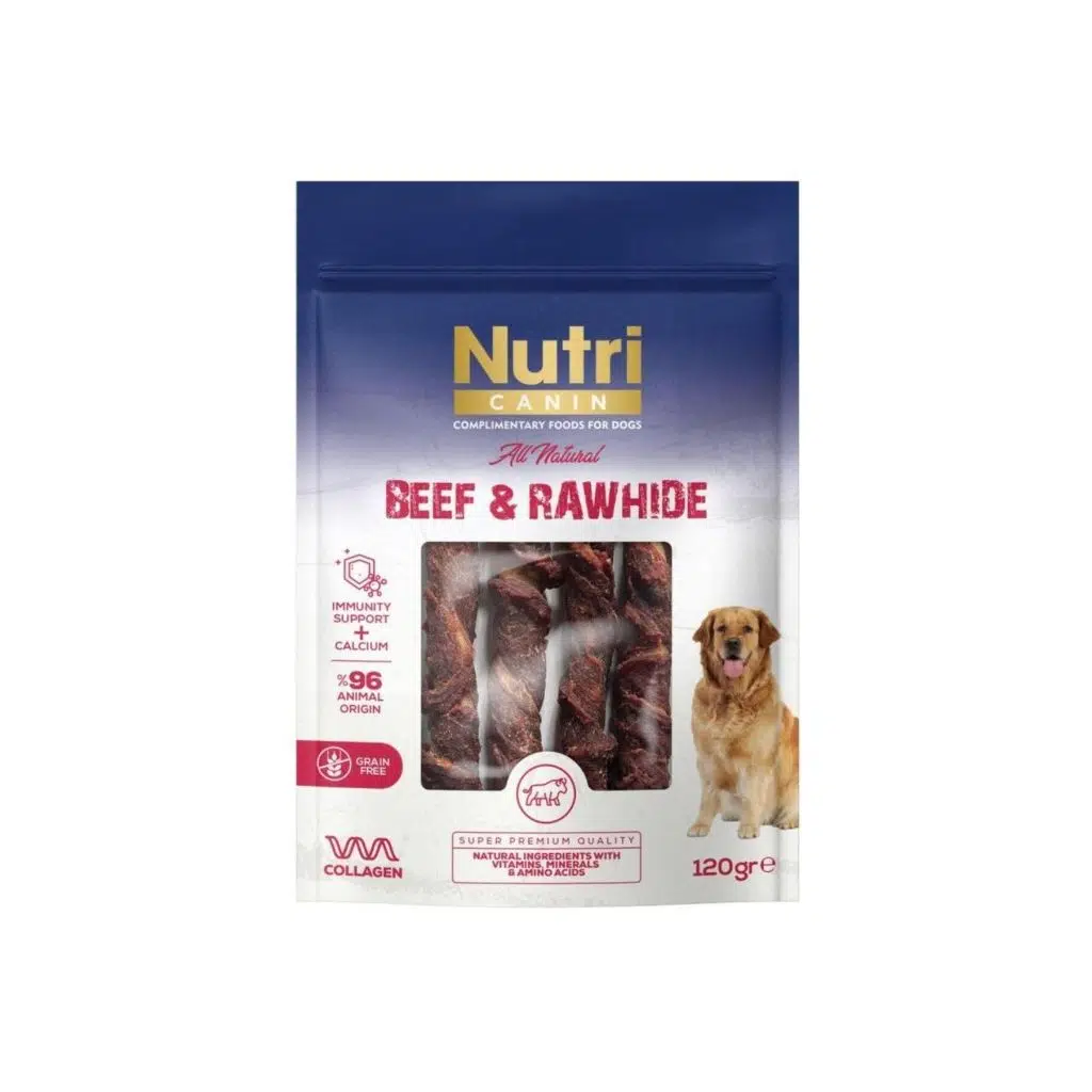 NUTRI CANIN RAWHIDE SNACK – SIĞIR Bileşimi: Sığır %56, Sığır Derisi %40, Patates Nişastası, Tuz, Gliserin, Sorbitol, E Vitamini. Analitik bileşenler: Ham protein %65, ham yağ %7.5, ham lif %1.8, ham kül %3.6, nem %16. Besleme kılavuzu: Köpeğinizin günlük gıdasına ilave olarak verilir. Günlük tam mama yerine gecmez. Köpeğinizi mutlu eden bir atıştırmalıktır. Köpeğiniz icin sürekli taze icme suyu bulundurunuz. Serin ve kuru yerde saklayınız. Son kullanma tarihi/ lot numarası: Paket üzerinde basılmıştır.