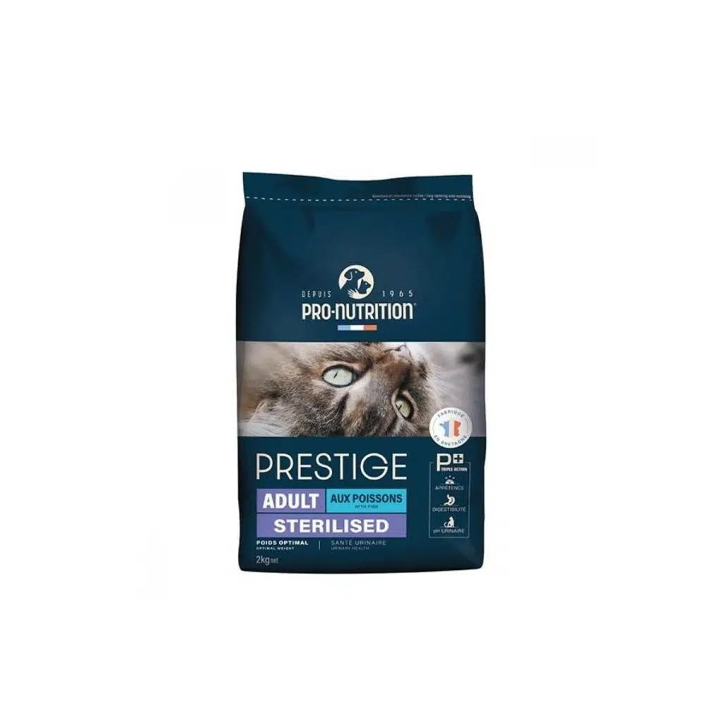 Pro Nutrition Prestige Sterilised Balıklı Kısırlaştırılmış Kedi Maması, Kısırlaştırılmış ve daha az aktif yetişkin kedilerin, optimum vücut kondisyonunu ve iyi sağlığını korumak için eksiksiz ancak düşük kalorili bir diyete ihtiyaçları vardır. Kediniz, PRESTIGE CAT ADULT STERILIZED balık mamasının enfes lezzetini çok sevecek, Günlük rasyon hacmini azaltmadan kilo alımını azaltırken tokluk hissini artıran düşük kalorili formül. L-Karnitin: Kedinizin yağları daha iyi kullanmasına ve ideal kilosunu korumasına yardımcı olur. Açlığı azaltmak ve iyi sindirimi desteklemek için doğal protein ve lif (bakla ve elma), Sağlıklı bir cilt ve parlak bir tüy için yağ asitleri ve peptit kaynakları, E vitamini, biotin ve çinko ile birlikte, Böbreklerin aşırı yüklenmesini önlemek, idrar pH'ının optimal düzeyde tutulması ve idrar taşı riskini sınırlamak için gereklidir. Tüy yumağı oluşumunu sınırlamaya ve sindirim sağlığını korumaya yardımcı olur.