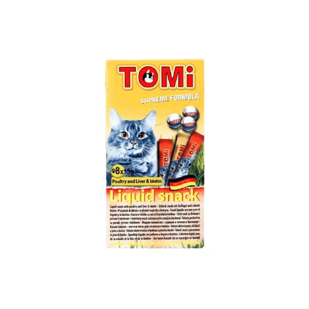 Tomi Liquid Snack Ciğerli ve Biyotinli Kedi ÖdülüÜrün Kodu:;897025Yavru ve yetişkin kediler için önerilen tamamlayıcı kedi mamasıdır.Sıvı aperatifler çok çeşitli kullanım alanına sahip kedi ödülleridir. Kuru mamaya alıştırmak için kullanıldığı gibi bu lezzet sıvıları direk kedi ödül kreması olarak da kullanılabilir. İştahsız kedilerde besin gereksinimlerinin bir kısmını karşılamaları için önerilir. Sıcak yaz aylarında derin dondurucuda dondurma gibi dondurularak servis edilebilir. İçeriğindeki biotin veya inülun gibi katkı maddeleri ile sağlığa katkıda bulunabilirsiniz. Kedilerin ilk Tomi krema ile temasdan sonra sabırsızlığını gördüğünüzde ne kadar lezzetli olduğunu anlayabilirsiniz.Tomi;Liquid Snack ürünlerin de;GDO içermez. Üretim süresinde antioksidanlar ve koruyucular kullanılmadan tamamen doğal olarak üretilmiştir.Paket içerisinde 15gramlık;8 adet ödül çıkmaktadır.